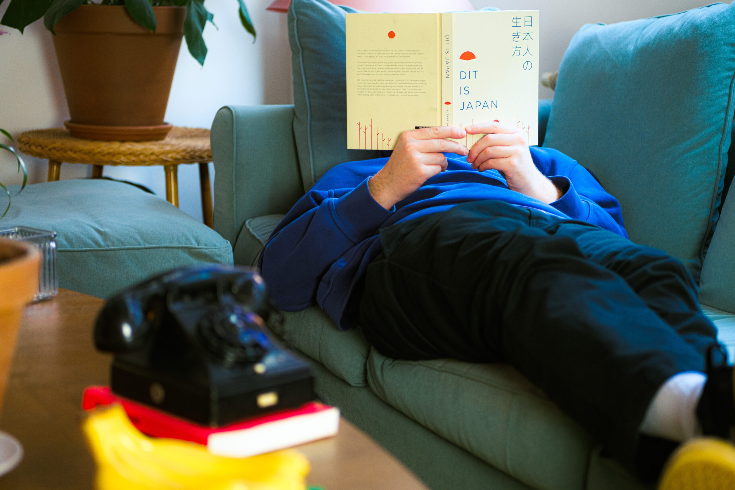 gele typemachine, draaitelefoon en notitieblok gefotografeerd op tafel